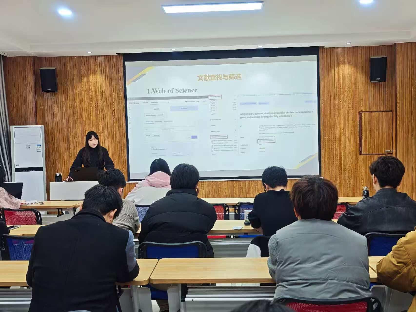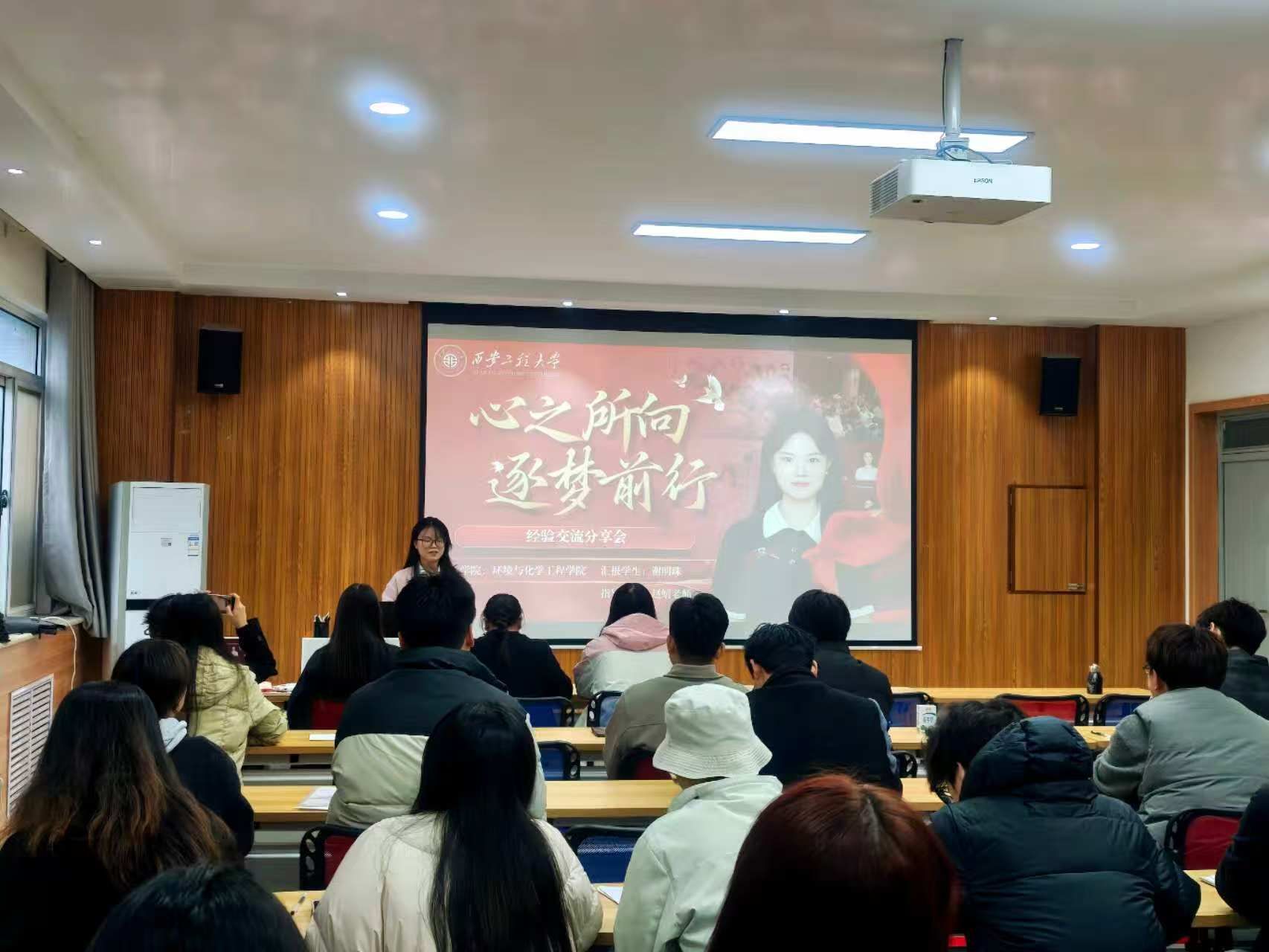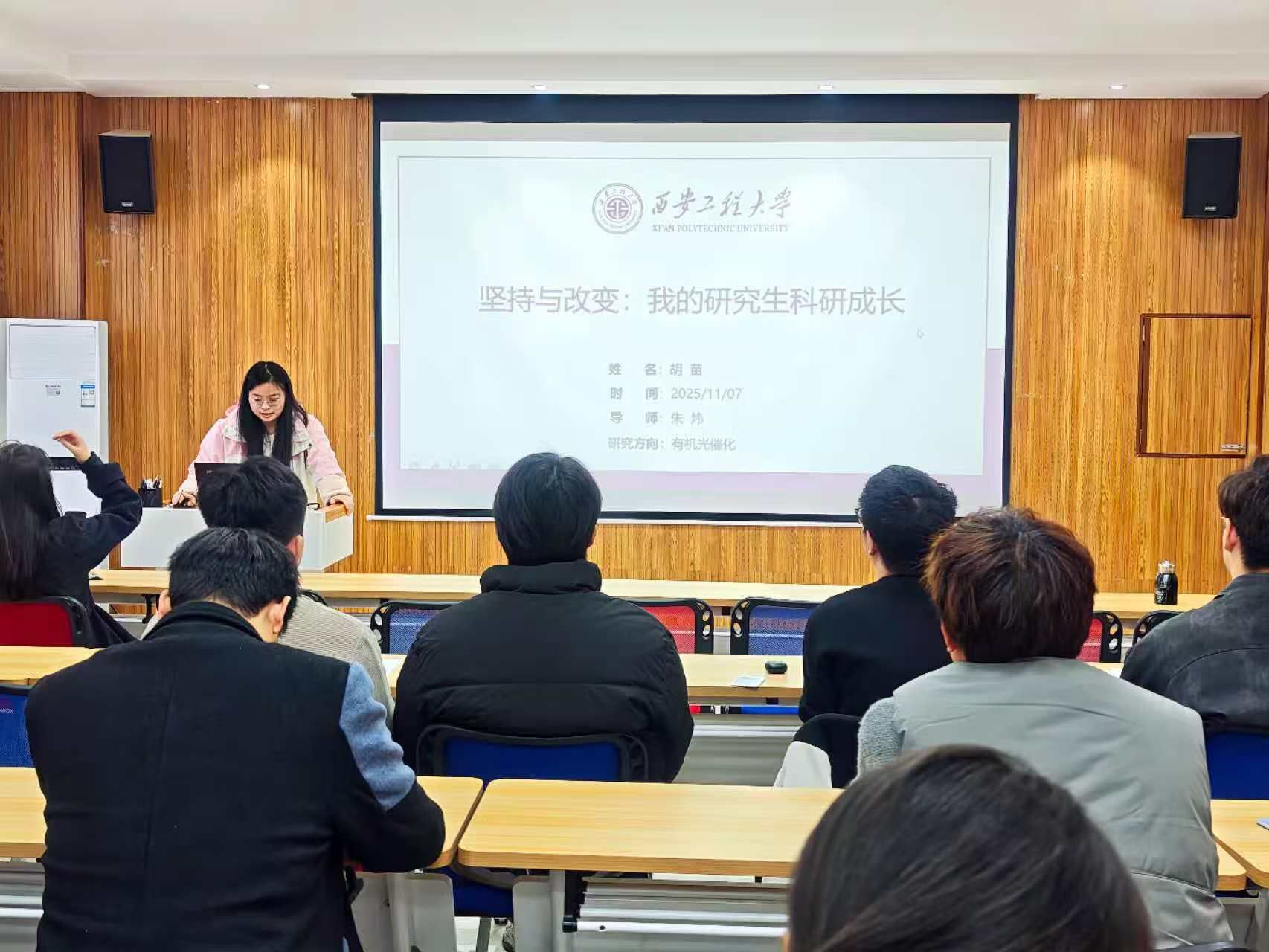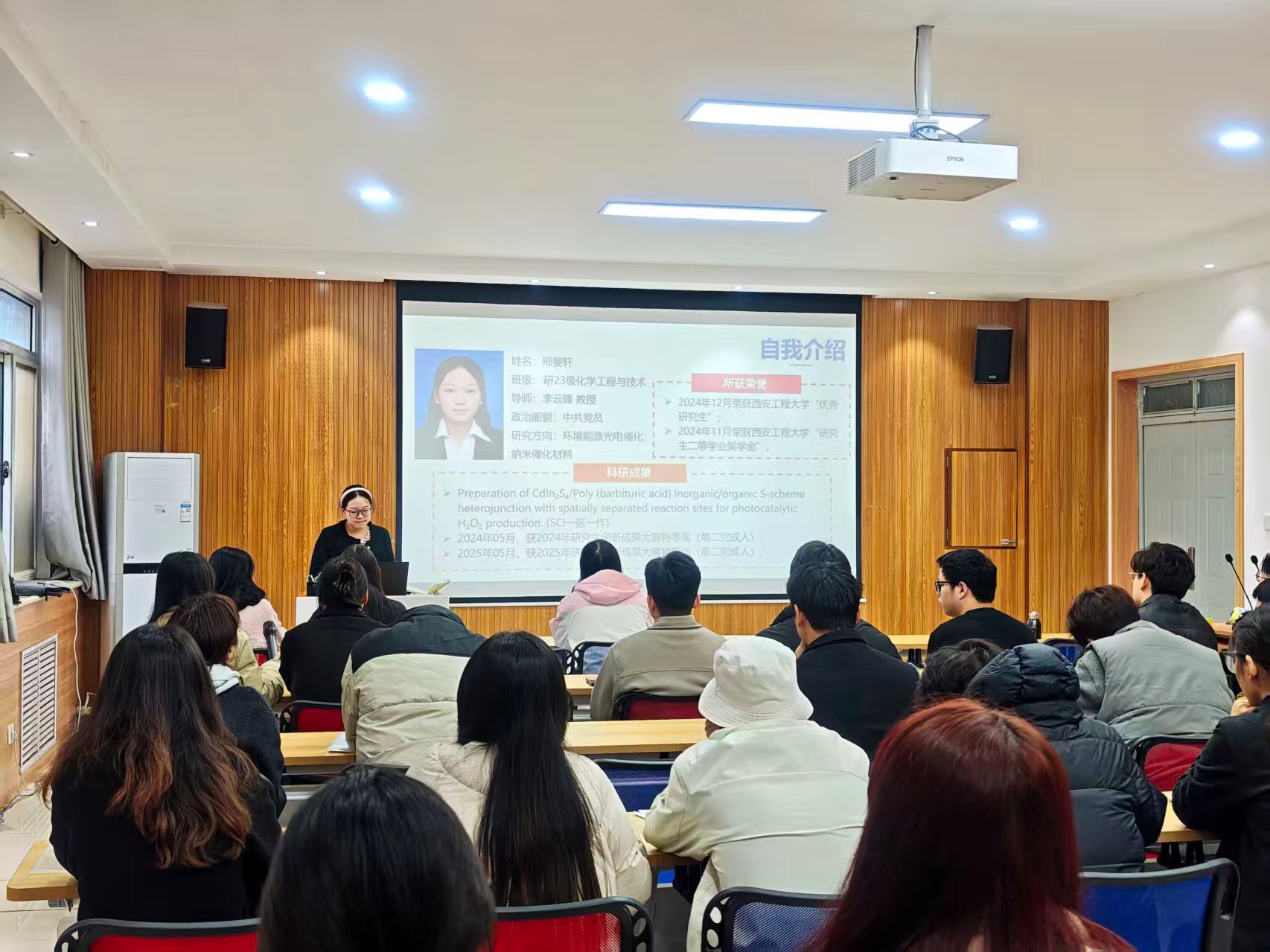 党建助理期间的心得体会,她强调,合理规划时间、适配学习方法,是平衡学业与工作的关键。王佳瑶以自己发表的论文为切入点,系统阐述了“研分三阶段”的成长规划与能力锻造路径,提醒同学们锚定目标、深耕专业、持续前行。胡苗同学则以其论文“三协同的废水处理材料创新”为例,分享了科研成果向实际应用转化的实践智慧与思考。