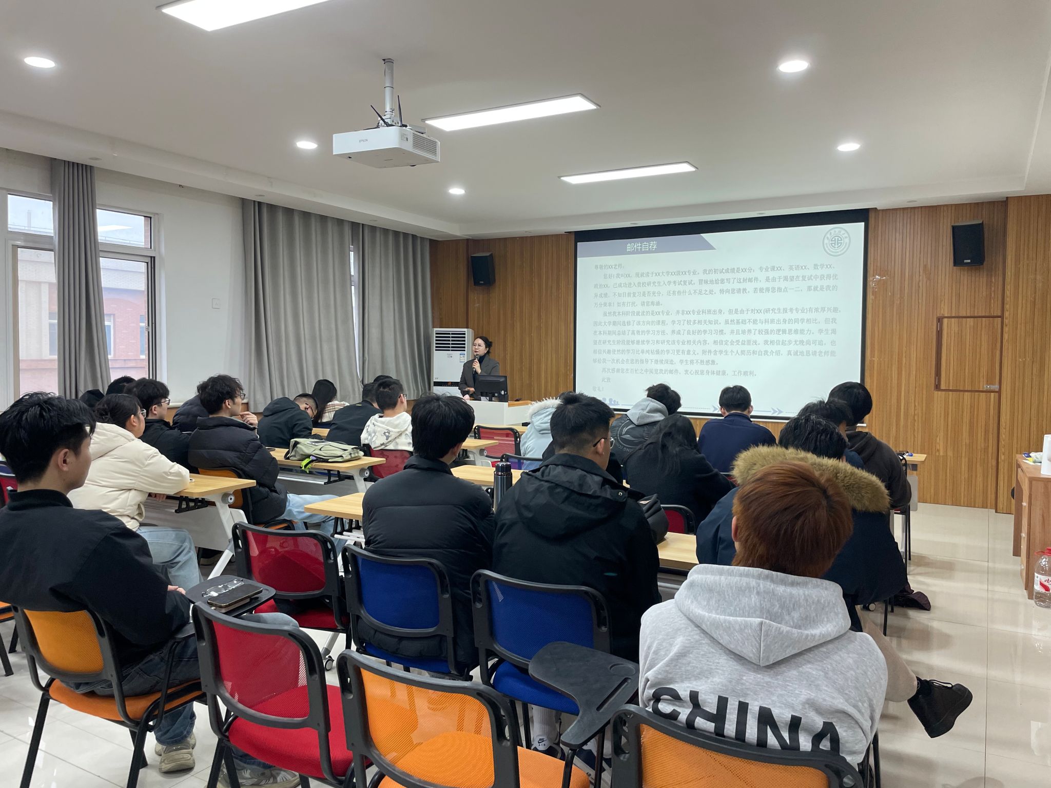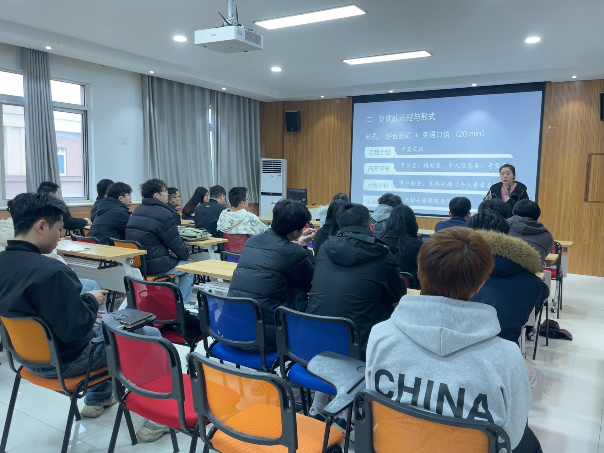 会上,学府考研李老师首先围绕复试面试环节进行了系统讲解。她从面试礼仪入手,强调了仪容仪表与行为举止的重要性,并深入剖析了复试评分标准与考察要点。针对考生普遍关注的英文自我介绍,李老师结合实例分析,提供了实用的准备策略和表达技巧。