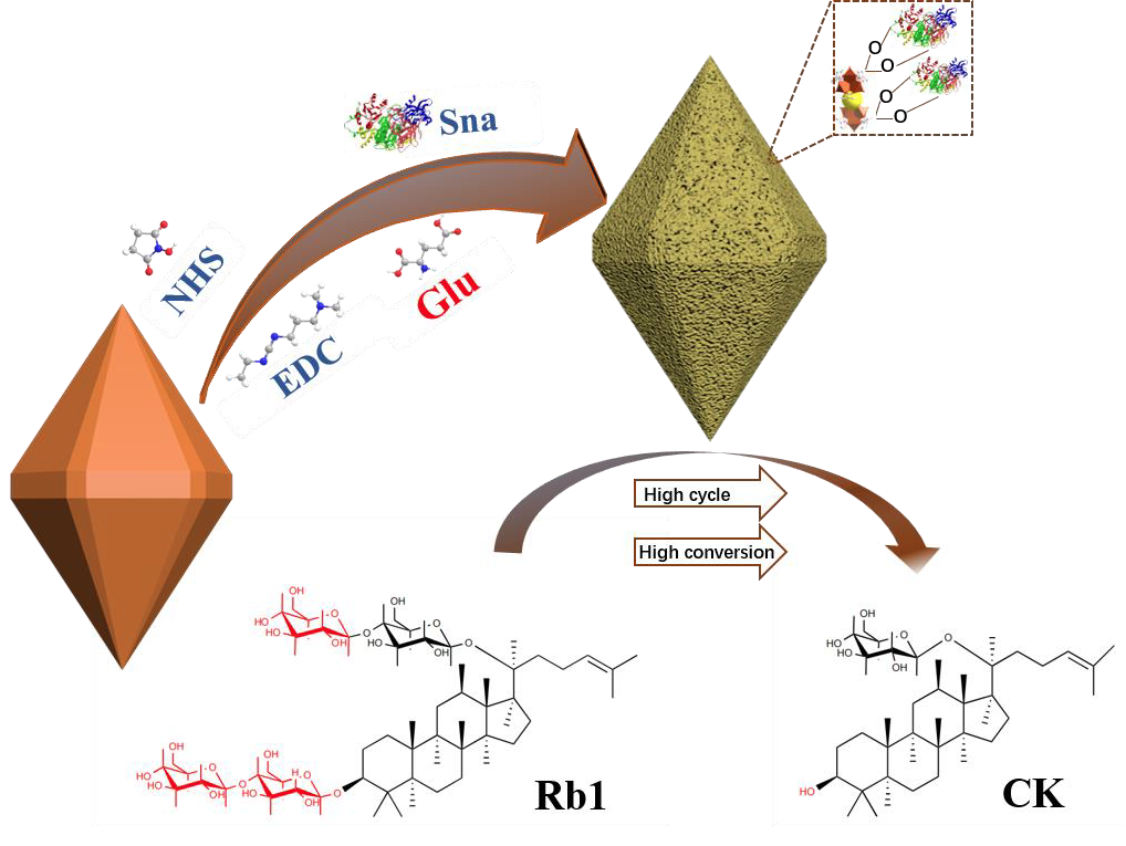 在生物催化体系构建与性能强化方面,课题组围绕酶催化过程中稳定性不足与难以重复利用等关键问题,开展了基于功能化金属有机框架材料的固定化策略研究。通过引入天然谷氨酸对铁基金属有机框架材料MIL-88B (Fe)进行表面修饰,构建新型复合载体体系,并结合共价接枝方法实现酶分子的高效固定化。该研究创新性地利用有机配体调控载体界面化学环境与空间结构,有效改善了酶分子微环境与构象稳定性,克服了传统游离酶体系在工业应用中的局限性,为稀有人参皂苷CK的绿色高效制备提供了重要技术路径。研究成果以“Immobilization of snailase on glutamate modified MIL-88B(Fe) to efficiently convert the rare ginsenoside CK with high enzyme recyclability and stability”为题发表于国际期刊《International Journal of Biological Macromolecules》(中科院一区TOP,IF 7.7),曹翠博士为第一作者,武占省教授为通讯作者,色情视频 为通讯单位。