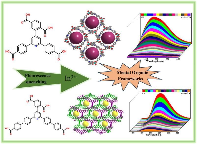 论文一:采用吡啶修饰的四羧酸配体合成了两种新型In-MOF(MOF1和MOF2)。荧光检测表明,两者均能通过荧光猝灭从混合离子中选择性识别水中的Fe3+。本研究证实水稳定性In-MOF可作为检测金属阳离子的实用传感材料(图1)。