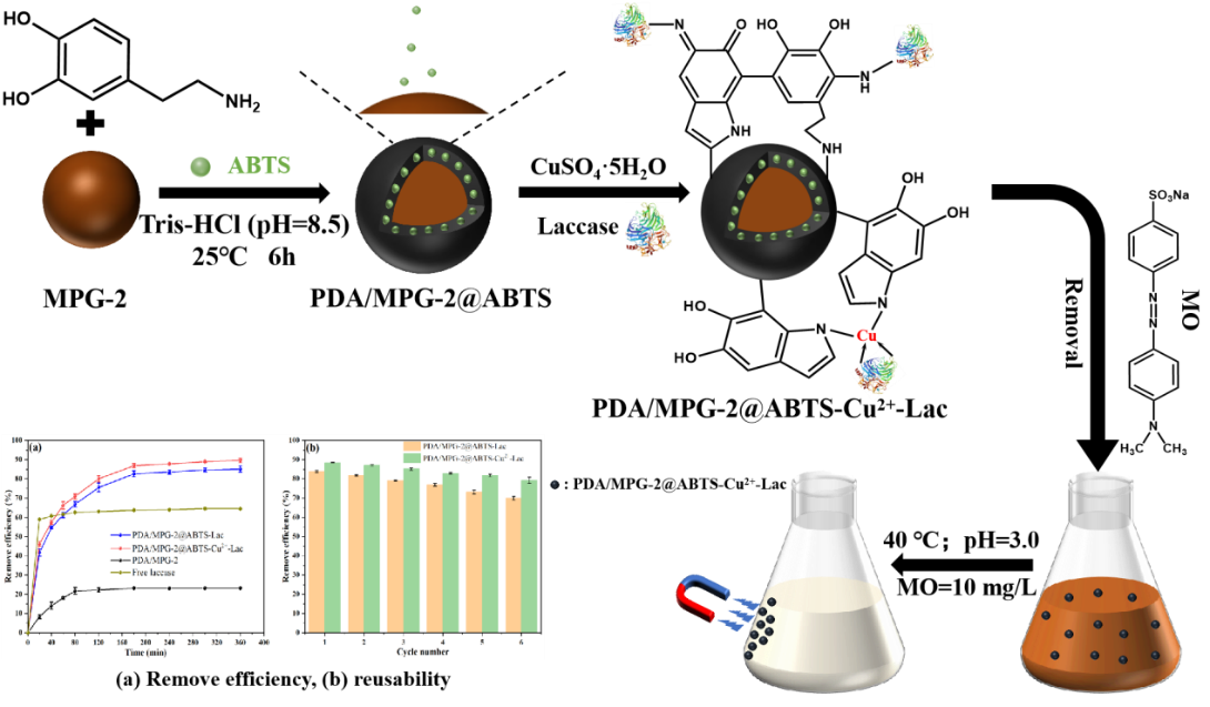 为进一步提升酶载量,采用盐酸多巴胺(PDA)作为界面功能分子,利用其强黏附性和丰富的官能团,对MPG-2进行表面涂层修饰,并实现了介体ABTS与漆酶的共固定化。所构建的固定化体系PDA/MPG-2@ABTS-Lac和PDA/MPG-2@ABTS-Cu²⁺-Lac均表现出高载酶量(分别为62.1 mg/g和61.3 mg/g)和高活性回收率(分别为107.9%和135.1%)。在模拟废水降解实验中,两种体系均能在3小时内实现85%以上的甲基橙去除率。此外,固定化酶在高温、宽pH范围以及多次循环催化过程中均表现出优异的稳定性,显示出在实际废水处理应用中的巨大潜力。本研究为开发高效、稳定的酶基水净化材料提供了新的策略和技术基础。研究成果以“Cu²⁺-Enhanced Magnetic Mediator–Laccase Co-Immobilized System for Efficient Methyl Orange Degradation in Wastewater”为题发表于国际期刊《Journal of water process engineering》,潘虹老师为第一作者,生物化工专业2023级研究生戴宜轩为第二作者,王晓军老师为通讯作者,色情视频 为通讯单位。