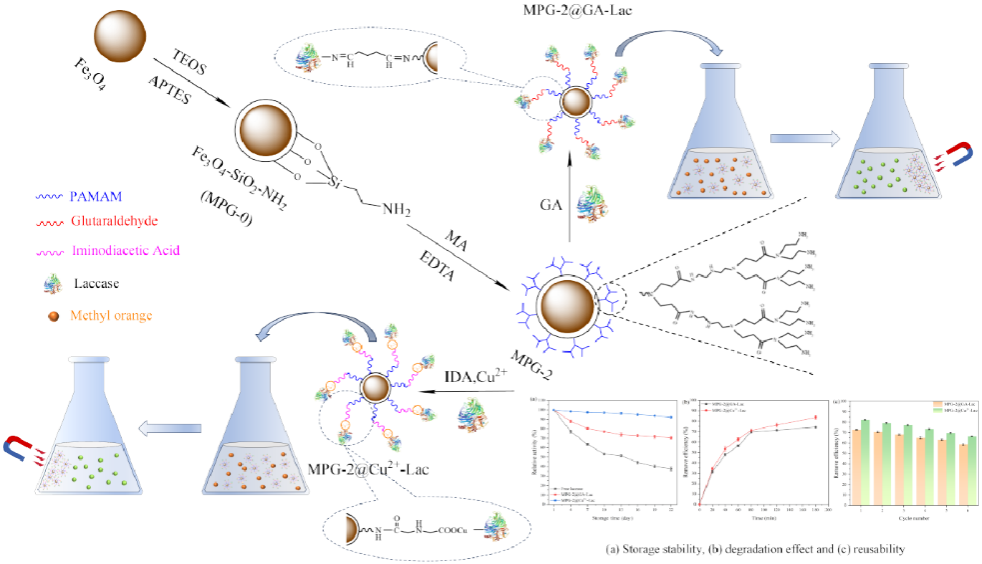 在传统的染料废水处理中,甲基橙作为典型的难降解有机污染物,一直是治理的重点与难点。虽然漆酶作为一种绿色催化剂在染料脱色方面潜力巨大,但游离漆酶稳定性差、难以回收的弊端长期制约着其工业化应用。针对这一瓶颈,王晓军副教授、潘虹博士团队以四氧化三铁为核,通过在其表面修饰超支化聚酰胺-胺树状大分子,创新性地构建了一种新型磁性树状大分子,并通过不同方法制备了两种固定化漆酶,用于甲基橙染料的去除。发现6次循环操作后仍能保持固定化漆酶仍能保持66.18%的甲基橙去除效率。研究成果以“Preparation of Magnetic Dendrimer and Immobilization of Laccase for Methyl Orange Dye Removal”为题发表于国际期刊《BioNanoScience》,材料与化工专业2022级研究生陆天炆为第一作者,潘虹老师为通讯作者,色情视频 为通讯单位。