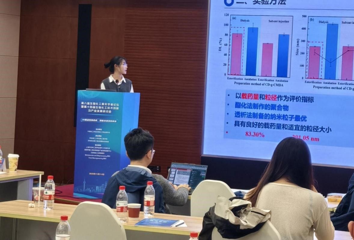 研究生刘雨婷在会议上分享了“高载人参皂苷CK羧甲基壳聚糖纳米粒子的制备及其抗肝癌活性研究”的学术报告,阐述了具有肿瘤靶向聚集和释放性能的纳米粒子使HepG2细胞存活率从58.63%降至46.04%,其抑癌效果显著增强。
